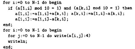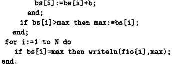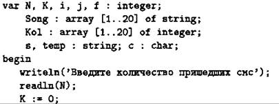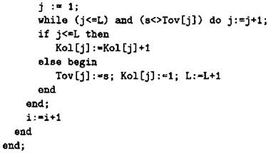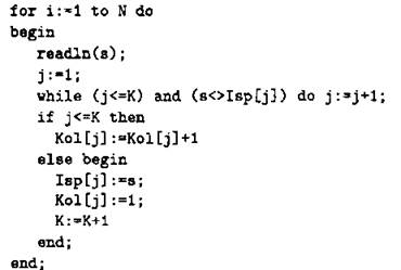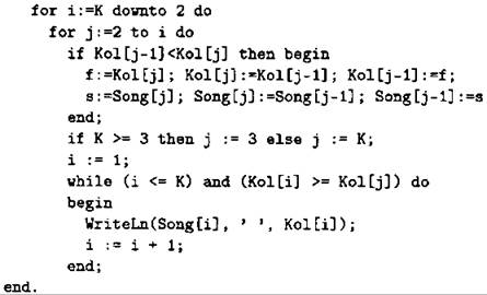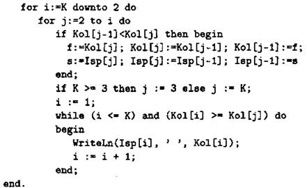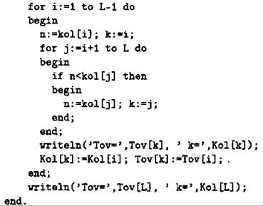 {Выводим на экран значения массивов Tov и Kol в порядке убывания значений массива Kol. Для этого, начиная с первого элемента, находим наибольший элемент массива Kol и выводим на экран этот элемент и соответствующий ему элемент массива Tov. На место найденного элемента ставим первый. Далее находим наибольший, начиная со второго элемента массива Kol, и т.д.}