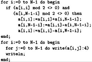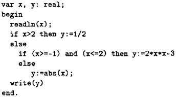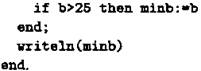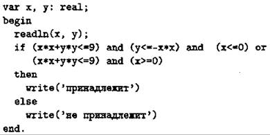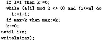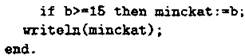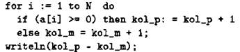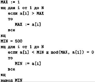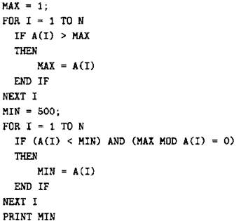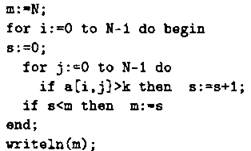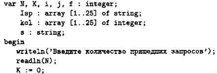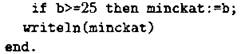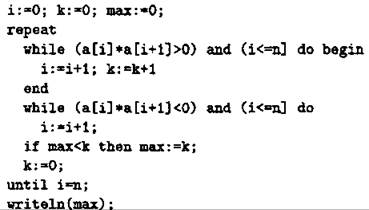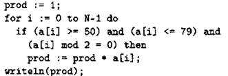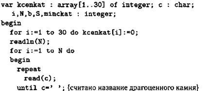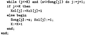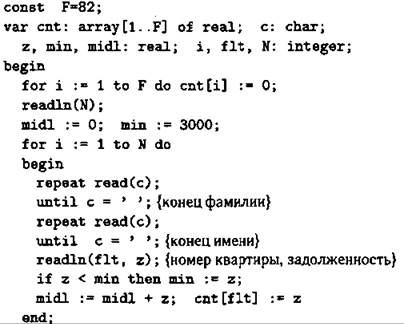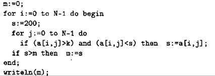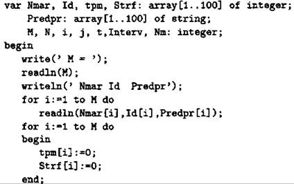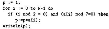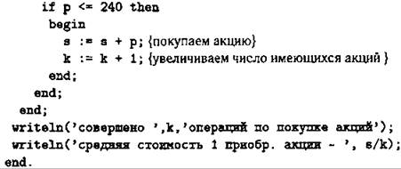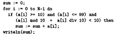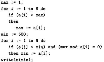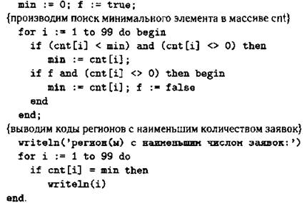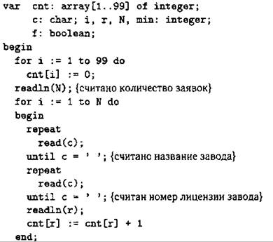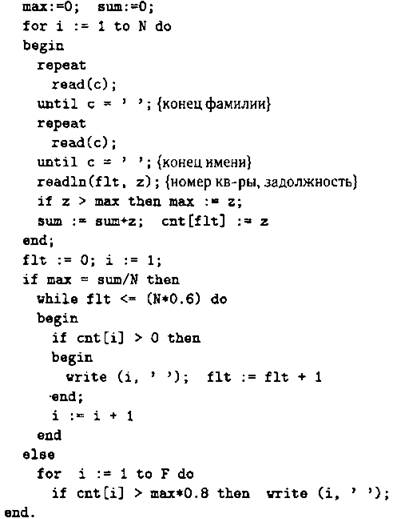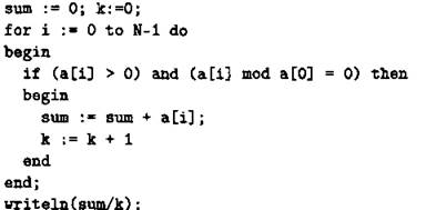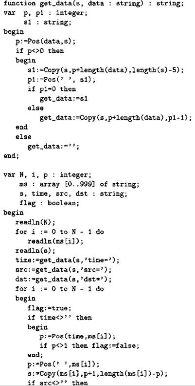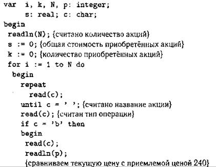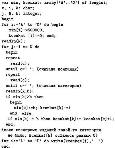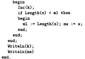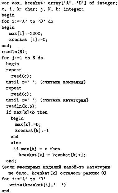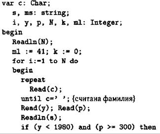 Программа читает все входные данные один раз. При прочтении данных очередной книги сразу проверяются условия: издана ли эта книга ранее 1980 года и содержит ли она не менее 300 страниц. Если оба условия одновременно выполняются, то значение счётчика увеличивается на единицу и проверяется условие: является ли название такой книги меньше уже просмотренных. В результате прочтения данных обо всех книгах становятся известны количество искомых книг и самое короткое название. Пример программы на языке Паскаль.