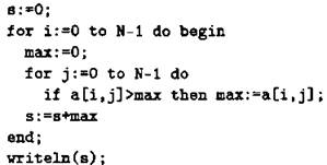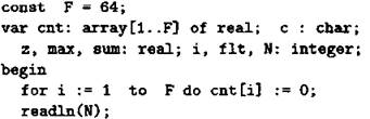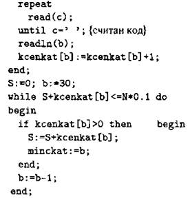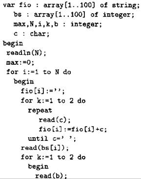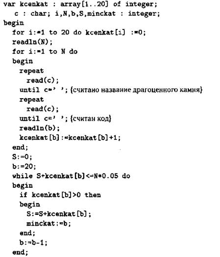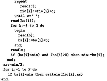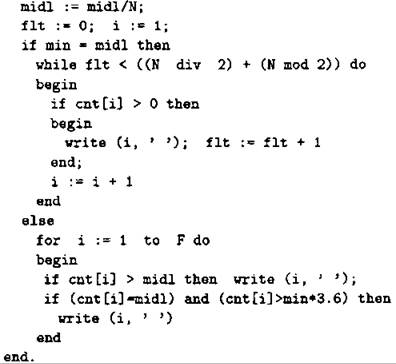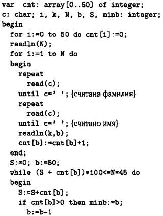 Программа читает все входные данные один раз, сразу подсчитывая в массиве с индексами от 0 до 50 количество участников, набравших тот или иной балл. Путём просмотра этого массива с конца (от 50-ти баллов) определяется число участников, заведомо попадающих в число 45% лучших (добавление всех участников, набравших следующий балл, приводит к выходу за 45%). Последний балл, который набрали не менее одного участника, запоминается. Если хотя бы один из следующих участников также попадает в 45%, то проверяется, набрал ли он и следующие, набравшие столько же баллов, более половины баллов. В этом случае они все добавляются к числу победителей и призёров, и их балл является искомым. Пример программы на языке Паскаль.