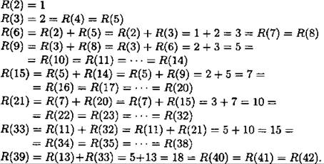 Обозначим R(n) — количество программ, которые преобразуют число 1 в число n. Обозначим через t(n) наибольшее кратное трём (не превосходящее n), такое, что Верны следующие соотношения: 1. Если n делится на 3 и n/3 — простое, то R(n) = R(n/3) + R(n — 1) (для n > 3). 2. Для всех других чисел (не указанных в п. 1, за исключением числа 3) R(n) = R(t(n)), так как существует единственный способ получения n из t(n) — прибавлением единиц. При n = 3 R(n) = 2 (два способа: прибавление двух единиц или однократное умножение на 3). Поэтому достаточно постепенно вычислить значения R(n) для всех чисел, кратных трем, не превосходящих 42, таких, что п/3 — простое: сначала вычисляем R(1), затем R(3), R(6) и т.д. Имеем: