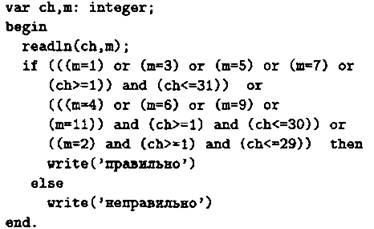 Уcл. 2 m = 4 или m = 6 или m = 9 или m= 11) и ch ≥ 1 н ch ≤ 30 |