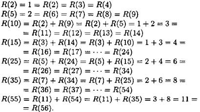 Обозначим R(n) — количество программ, которые преобразуют число 1 в число п. Обозначим через t(n) наибольшее кратное трём (не превосходящее n), такое, что Верны следующие соотношения: 1. Если п делится на 5 и n/5 — простое, то R(n) = R(n/5) + R(n — 1) (для n > 5). 2. Для всех других чисел (не указанных в п. 1, за исключением числа 5) R(n) = R(t(n)), так как существует единственный способ получения n из t(n) — прибавлением единиц. При n = 5 R(n) = 2 (два способа: прибавление двух единиц или однократное умножение на 5). Поэтому достаточно постепенно вычислить значения R(n) для всех чисел, кратных трем, не превосходящих 56, таких, что n/5 — простое: сначала вычисляем R(1), затем R(5), R(10) и т.д. Имеем: