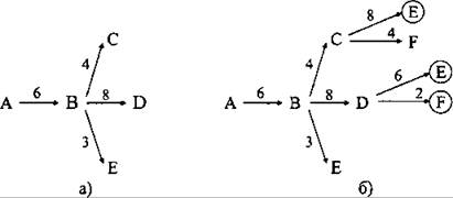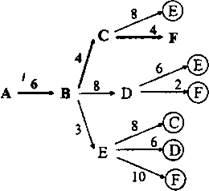 По первой строке таблицы определяем, что из пункта А можно попасть только в пункт В. Далее, из пункта В (без возврата) можно попасть в пункты С, D и Е. (см. рис. 92, а).