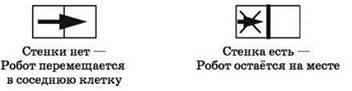 При выполнении любой из этих команд РОБОТ перемещается на одну клетку соответственно: вверх ↑, вниз ↓, влево ←, вправо →.