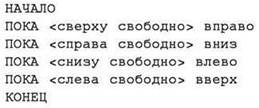 Теперь они поочерёдно перебираются и проверяются, сможет ли РОБОТ, начав путь из какой-либо точки, вернуться в неё. При этом следует учесть, что если движение в каком-то направлении невозможно, так как оно изначально “запрещено” стенкой, то соответствующая строка программы пропускается, и необходимо сразу “переходим к следующей”, а если РОБОТ при движении сталкивается со стенкой, то выполнение программы прерывается, так как РОБОТ разрушился.