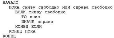 • Когда начинается очередной проход цикла, проверяется наличие стенки снизу. Если её нет, то выполняется перемещение на 1 клетку вниз. Если же стенка снизу есть, то выполняется перемещение на 1 клетку вправо, причём без проверки наличия стенки справа. Следовательно, все клетки, в которых есть стенки снизу и есть стенки справа, можно было бы сразу пометить как непригодные (начав движение из них, РОБОТ разобьётся). Но это не требуется: ведь такое условие записано в цикле ПОКА, который контролирует каждый отдельный шаг РОБОТа. (Вот если бы в цикле ПОКА было записано два или больше таких оператора ЕСЛИ, то для второго и т.д. такого оператора пришлось бы это исключение клеток сделать.)