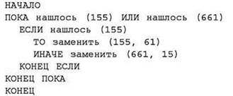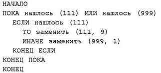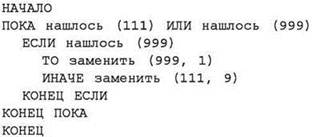 6. Что будет дальше? Очевидно, условие ПОКА по прежнему истинно: если нет трёх девяток подряд, то три единицы подряд в строке имеются. А вот условие ЕСЛИ по-прежнему ложно (девяток только две), поэтому на очередном проходе цикла будет выполнена ветвь ИНАЧЕ. В ней выполняется замена первых имеющихся трёх единиц на одну девятку: