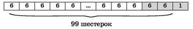 Нетрудно догадаться, что количество шестёрок на каждом таком “промежуточном” этапе кратно 3. Проследим теперь, что происходит со строкой, когда её длина сократится до, например, семи знаков (шесть шестёрок плюс единица в конце):