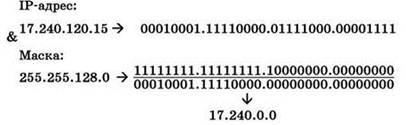 Маской IP-адреса называют число (так же, как и IP-адрес, состоящее из четырёх записанных через точку байтовых значений от 0 до 255 каждое), которое определяет, какую часть IP-адреса составляет адрес сети. Для этого нужно представить и исходный IP-адрес, и маску как набор двоичных чисел, а затем поразрядно выполнить их конъюнкцию: если в каком-либо разряде маски записана “1”, то значение соответствующего разряда исходного IP-адреса переписывается без изменения, а если в маске записан “0”, то соответствующий разряд IP-адреса обнуляется (можно сказать, что “0” в маске “гасит” до 0 соответствующий разряд исходного IР-адреса). Полученная в результате запись и будет указывать IP-адрес сети (каждое из её двоичных чисел можно вновь перевести в десятичную систему счисления).