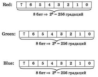 Данный способ кодирования цветовых оттенков соответствует широко используемому в современных ПЭВМ 24-битному методу цветового кодирования TrueColor. Нетрудно подсчитать, что данный метод обеспечивает 256 х 256 х 256 = 28 + 8 + 8 = 16 777 216 различных цветовых оттенков.