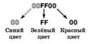 В данном случае яркости красного и синего основных цветов — минимально возможные (значение 00, т.е. нуль), а яркость зелёного цвета — максимально возможная (FF16 = 111111112 = 25510). Очевидно, что это — чистый зелёный цвет: