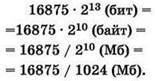 По условию задачи нужно сравнить полученный результат с различными вариантами ответа, приведёнными в мегабайтах. Поэтому результат вычислений требуется разделить сначала на 23, чтобы перевести биты в байты, а затем на 220 для перевода байтов в мегабайты:
