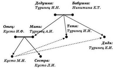 6) ID 110 — это Туринец И.И., женского пола (см. левую таблицу), значит, это тетя Кусто М.И., которая в данном случае нас не интересует;