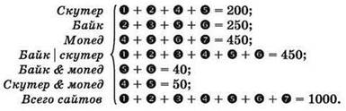 если по запросу байк | скутер было найдено 450 сайтов, по запросу байк & мопед — 40, а по запросу скутер & мопед — 50 сайтов?