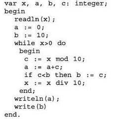 Теперь смотрим, что программа выводит на экран. Сначала это число а — сумма цифр числа х, равная 13. А потом — число b, указывающее что одна из этих цифр — цифра 5, причём она — наименьшая из всех цифр в числе х (однако количество этих цифр нам неизвестно).