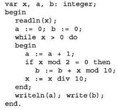 Вновь проанализируем алгоритм. В операциях mod и div вторым операндом является число 100, а не 10. Следовательно, теперь в цикле обрабатываются не отдельные цифры исходного числа, а числа, составленные из пар таких цифр.