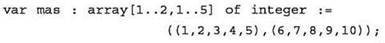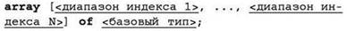 где <диапазон индекса> — записанные через две точки начальное и конечное значения индексов элементов по соответствующей размерности (целые числа или символы); <базовый тип> — тип элементов массива.