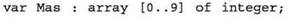 1) объявление одномерного массива из 10 целых чисел (базовый тип — integer), индексы которых меняются от 0 до 9: