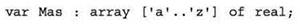 3) объявление одномерного массива из вещественных чисел (базовый тип — real), в качестве индексов которых используются латинские буквы: