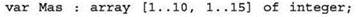 4) объявление двумерного массива размером 10 х 15 из целых чисел (базовый тип — integer), индексы которых отсчитываются с единицы: