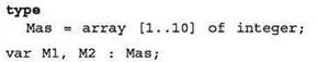 Здесь вначале описан “шаблон” одномерного массива из 10 целочисленных элементов, а затем по нему, как по образцу, определены два таких массива с именами M1 и М2. В результате с точки зрения программы оба эти массива полностью идентичны и для них допустима операция присваивания одного массива другому целиком: M1 : = М2 (все элементы массива М2 копируются в соответствующие им элементы M1).