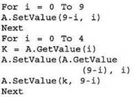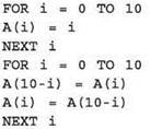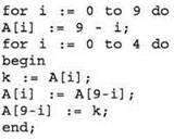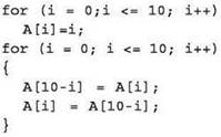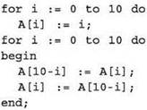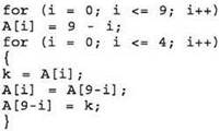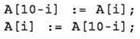 Эта алгоритмическая конструкция похожа на обмен местами двух элементов (i-го и (10-i)-го), но не является обменом, поскольку здесь не используется буферная переменная! Сначала в (10-i)-й элемент заносится значение i-то элемента (а прежнее значение теряется), а затем выполняется обратное присваивание, которое, очевидно, уже ничего не меняет.