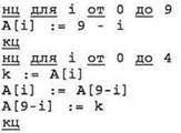 Эта алгоритмическая конструкция — обмен местами двух элементов (i-гo и (9-i)-гo) через буферную переменную k.