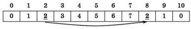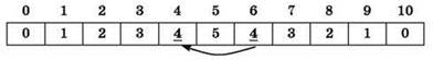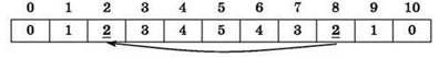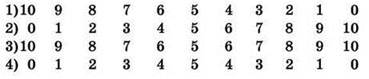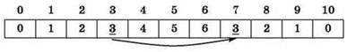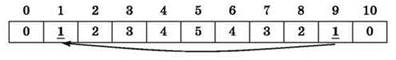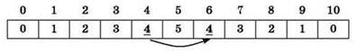 Ответ: массив 0, 1, 2, 3, 4, 5, 4, 3, 2, 1, 0 (вариант ответа №4).