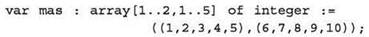 2) присваивание начальных значений элементам двумерного массива: