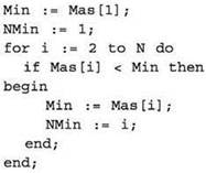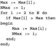 • При поиске максимума/минимума за предполагаемый максимум/минимум берется первый элемент массива либо константа, заведомо меньшая/большая любого элемента. Далее каждый очередной элемент массива сравнивается с предполагаемым максимумом/минимумом, и если этот элемент больше/ меньше предполагаемого максимума/минимума, то значение этого элемента запоминается в качестве нового предполагаемого максимума/минимума. Дополнительно при этом в отдельной переменной (переменных) может перезапоминаться индекс (индексы) очередного предполагаемого максимума/минимума.