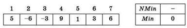 Пример 4: минимум среди положительных элементов массива (5, -6, -3, 9, 1, 3, 6), кратных трем, причём диапазон возможных значений элементов массива неизвестен: