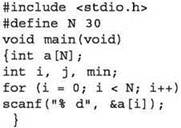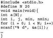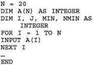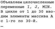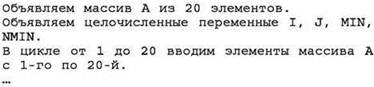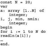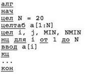 • поскольку в качестве предполагаемого минимума первоначально нельзя использовать первый элемент (он может оказаться не удовлетворяющим условию “20”), нужно в качестве первого значения предполагаемого минимума брать число, заведомо превышающее любое значение в массиве (в данном случае это может быть число 101);
