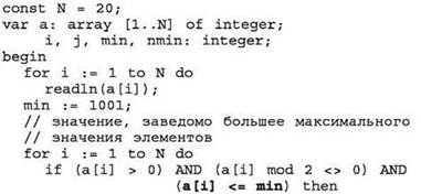 Если из условий задачи невозможно определить диапазон допустимых значений элементов массива, то в качестве предполагаемого минимума/максимума может быть взята произвольная константа (“заглушка”), заведомо не удовлетворяющая заданным условиям, а в операторе проверки условий переприсваивания предполагаемого минимума/максимума необходимо учесть необходимость замены этого “значения- заглушки” первым же элементом массива, удовлетворяющим условиям.