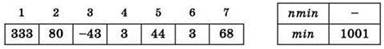 8) i = 1: Mas[1] = 333 — положительное, нечётное, но большее чем min:
