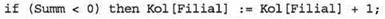 • если обнаружен убыток, т.е. Summ < 0, то значение ячейки массива-счётчика, соответствующей номеру филиала, увеличиваем на 1.