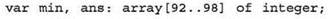 При этом принципы работы с этими массивами аналогичны работе с массивом-счётчиком: считанный номер марки бензина используется как индекс соответствующего элемента в массиве. (Массивы объявлены на 7 элементов каждый, при этом в каждом используется только по три элемента.)
