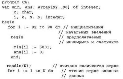 1) цена, по условию, не превышает 3000, поэтому при начальной инициализации ячеек массива min в качестве предполагаемых минимумов задаётся константа, заведомо большая максимально возможного значения цены (число 3001 или большее); счётчики количества значений, равных минимальному (массив ans), обнуляются.