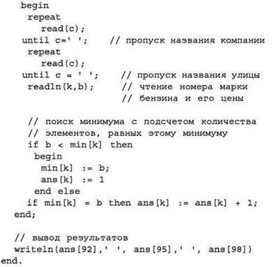 3) иначе если значение b равно текущему значению минимума для данной марки бензина min [k], то значение счётчика ans [k] увеличивается на 1.