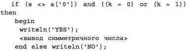 Задача 2. На вход программе подаётся набор символов, заканчивающийся точкой (в программе на языке Бейсик символы можно вводить по одному в строке, пока не будет введена точка, или считывать данные из файла). Напишите эффективную, в том числе и по используемой памяти, программу (укажите используемую версию языка программирования, например, Borland Pascal7.0), которая сначала будет определять, есть ли в этом наборе символы, соответствующие десятичным цифрам. Если такие символы есть, то можно ли переставить их так, чтобы полученное число было симметричным (читалось одинаково как слева направо, так и справа налево). Ведущих нулей в числе быть не должно, исключение — число 0, запись которого содержит ровно один нуль.