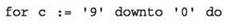 • перебираются цифры с 9 до 0 (цикл с параметром, изменяемым в обратном порядке — от '9' до '0'):