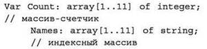 • если номера объектов идут не подряд. Например, известно, что вводятся номера школ, для которых обрабатываются какие-то данные: 215, 386, 512, 1167, 3160, тогда при создании массива-счётчика с полным диапазоном индексов от 215 до 3160 подавляющее большинство его элементов, кроме пяти с перечисленными индексами, будут не использованы.