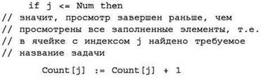 2) массив-счётчик просматривается с начала и до тех пор, пока не исчерпано количество заполненных его элементов (Num) и пока количество задач текущего вида не меньше количества задач того вида, что в отсортированных массивах (счётчике и индексном) расположен в месте под номером j. При этом, если различных задач меньше трёх, то будет выведена информация обо всех них, а если их больше трёх, то будет выведена информация о трёх первых по количеству видах задач, а также о следующих задачах (четвёртой и т.д.), если их количество совпадает с количеством задач третьего вида.