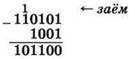 6. Деление многоразрядных двоичных чисел выполняется аналогично делению в столбик десятичных чисел. При этом на каждом шаге деления выполняется последовательное вычитание делителя из очередного делимого до получения остатка, равного 0 или 1, а подсчитанное количество вычитаний записывается как очередное значение частного.