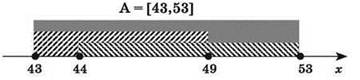 6) А теперь нужно правильно вычислить длину полученного отрезка А, помня, что речь идет о прямой натуральных чисел. В данном случае это не имеет особого значения, но в других аналогичных задачах при выполнении операции отрицания границы отрезка А могут быть “выколоты” (могут не входить в отрезок), и тогда нужно при вычислении длины отрезка брать соседние натуральные граничные значения внутри отрезка. В нашем же случае конечные точки 43 и 53 входят в отрезок А.