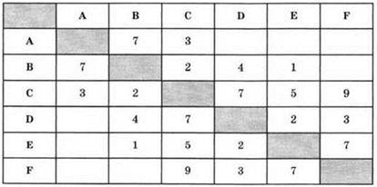 3. Между населёнными пунктами А, В, С, D, Е, F построены дороги, протяженность которых приведена в таблице. (Отсутствие числа в таблице означает, что прямой дороги между пунктами нет.)
