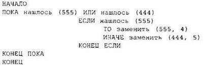 Эта команда заменяет в строке первое слева вхождение цепочки v на цепочку w. Например, выполнение команды заменить (222, 34)