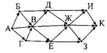 15. На рисунке — схема дорог, связывающих города А, Б, В, Г, Д, Е, Ж, 3, И, К. По каждой дороге можно двигаться только в одном направлении, указанном стрелкой. Сколько существует различных путей из города А в город К?