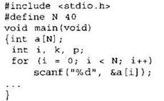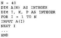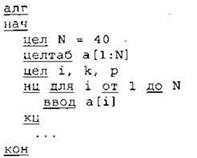 Объявляем массив А из 40 элементов. Объявляем целочисленные переменные I, К, Р. В цикле от 1 до 40 вводим элементы массива А с 1-го по 40-й. ... |