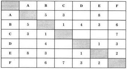 3. Между населёнными пунктами А, В, С, D, Е, F построены дороги, протяжённость которых приведена в таблице. (Отсутствие числа в таблице означает, что прямой дороги между пунктами нет.)