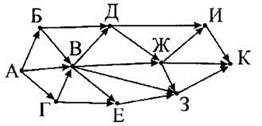 15. На рисунке — схема дорог, связывающих города А, Б, В, Г, Д, Е, Ж, 3, И, К. По каждой дороге можно двигаться только в одном направлении, указанном стрелкой. Сколько существует различных путей из города А в город К?